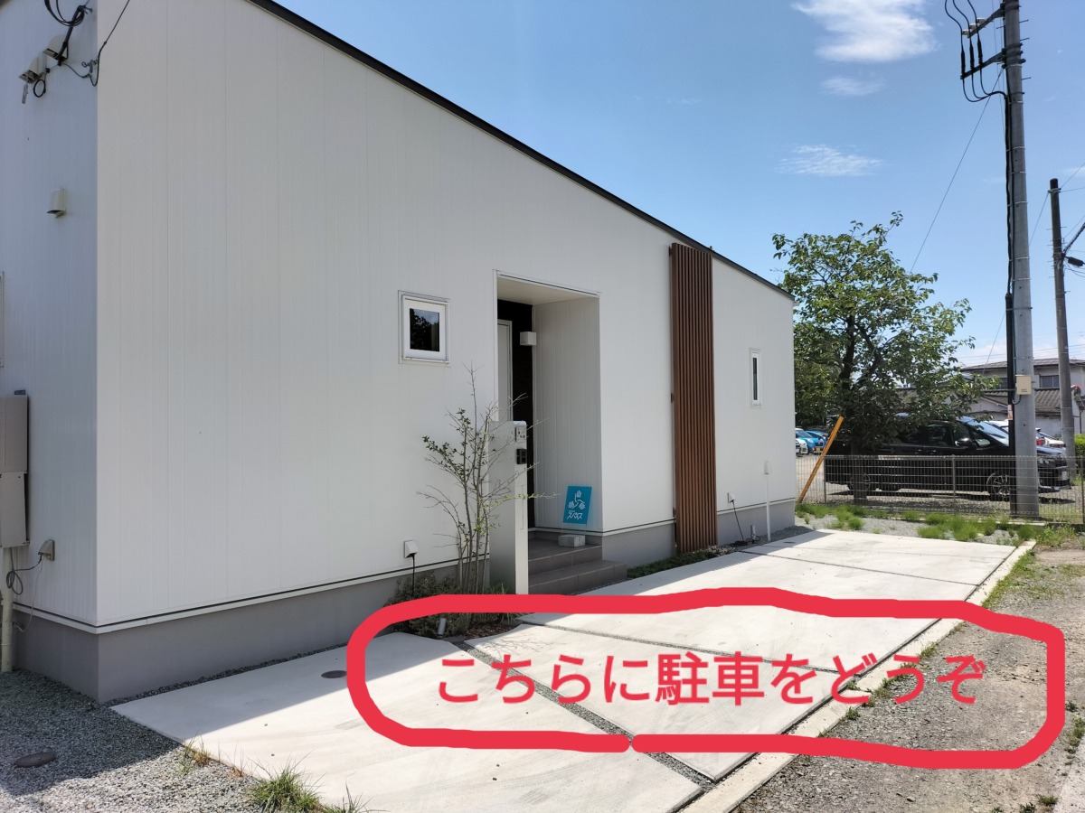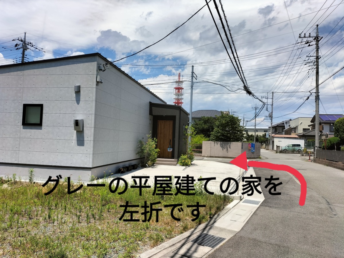 50メートルほど住宅地を進むと、左側にグレー色の平屋建物がありますので、左折します。