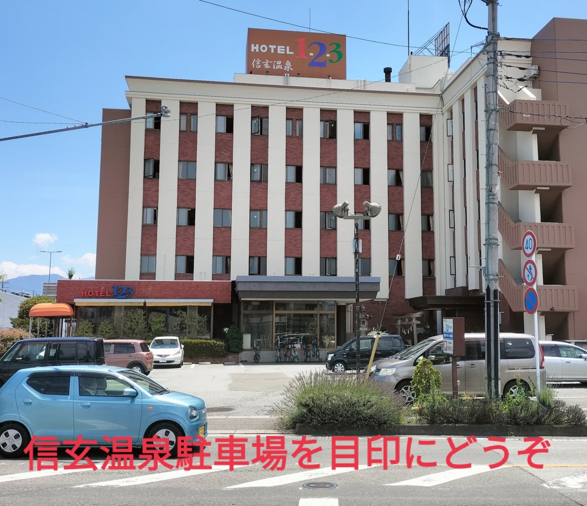 どうしても場所が分からない場合は、国母立体角に信玄温泉「HOTEL1・2・3」がありますので、