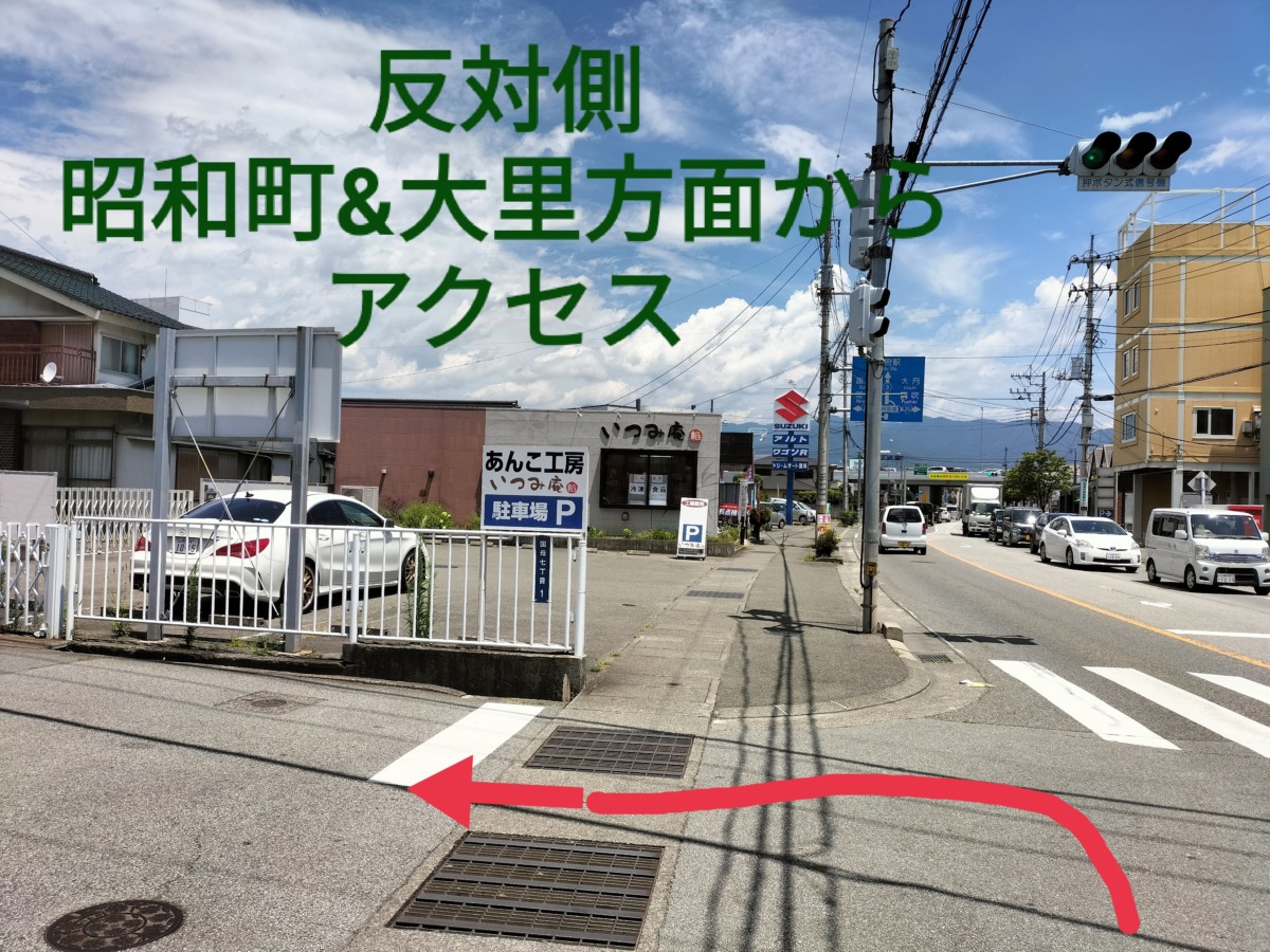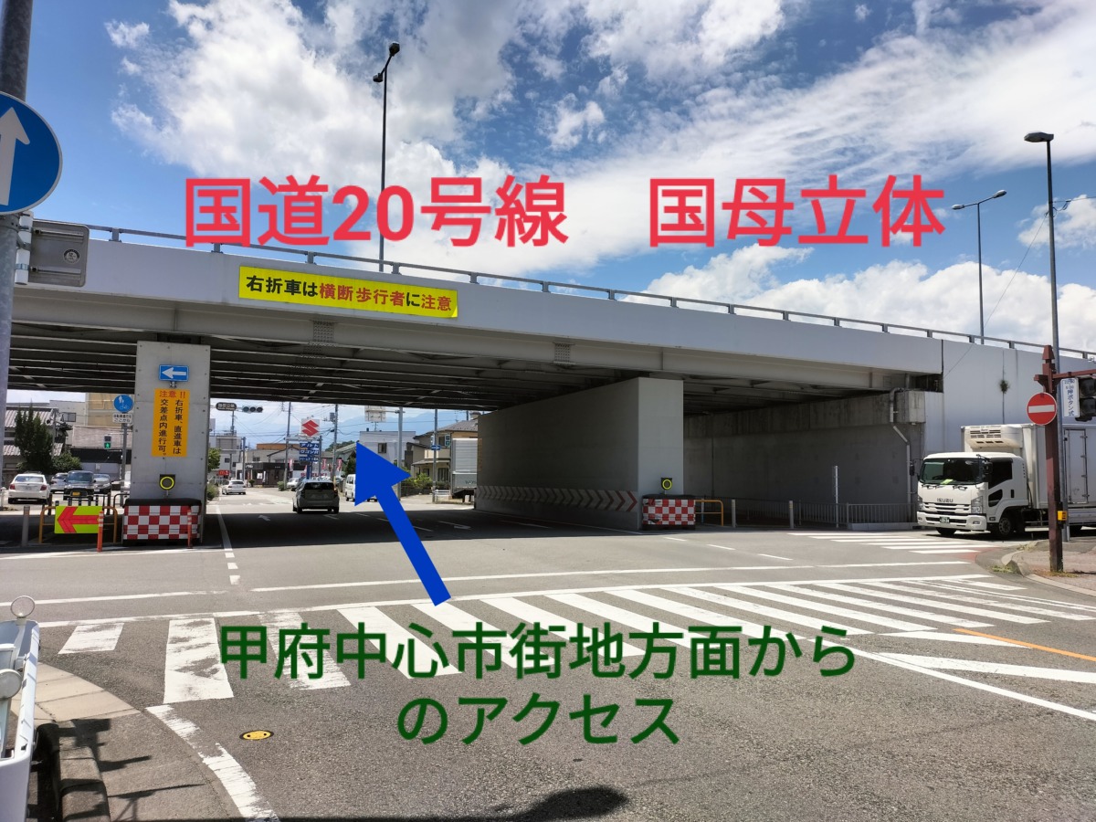 大里、昭和町方面からお越しの場合、国母立体手前の信号機を左折します。